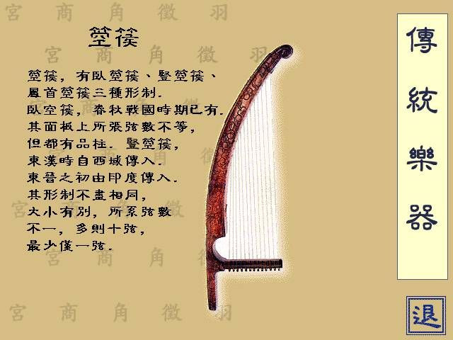 筝的称呼来自这件乐器的音响效果,古人说:施弦高且急,筝筝然也”,快而目者,真奏之声。筝最早为竹制的五弦乐器,汉魏演变为十二弦,唐以后为十三弦。明清至今,先后由十五弦,十六弦增加到二十一弦,二十五弦。代表曲目有“寒鸦戏水,昭君怨,黄鹂词,柳青娘,凤求凰”等。