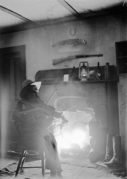 昔日牛仔哈利·帕顿在壁炉前拉小提琴(1908年)