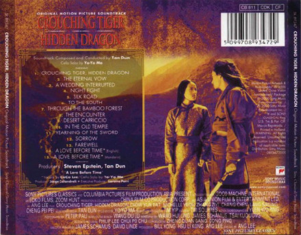 影片一开场便是主题音乐《卧虎藏龙》,马友友用大提琴演奏的忧伤而深沉的旋律自此就贯穿了整部影片。大提琴是整部音乐中最重要的组成部份。听这一张电影原声专辑,我总是会自然而然地想起影片中的一句台词,李慕白对俞秀莲说:“我并没有得道的喜悦,相反地,却被一种寂灭的悲哀环绕。这悲哀缠绕了我很久,使我无法再继续(闭关修练)”。整个音乐就和影片一样呈现出一种“很深的寂静”。