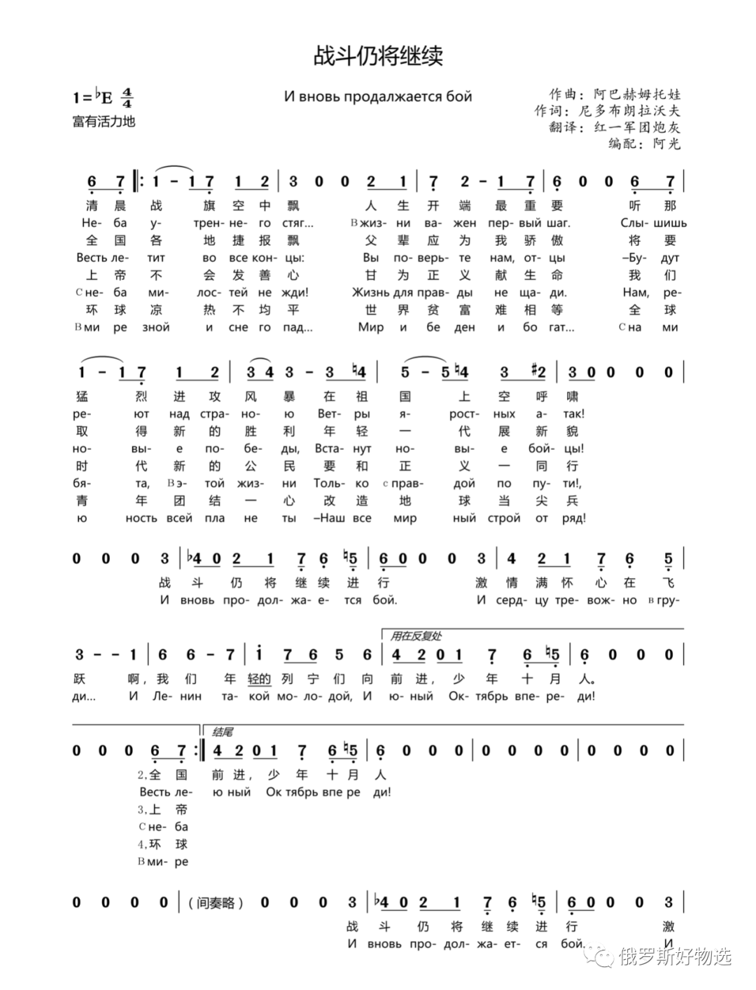 《战斗仍将继续》,又名《列宁那样年轻》,由苏联著名作曲家阿列克桑德拉·尼柯莱耶夫娜·巴赫慕托娃(Александра Николаевна Пахмутова)创作,首次出现在1974年苏联共青团十七大闭幕式上。