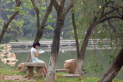 清晨来到树下读书