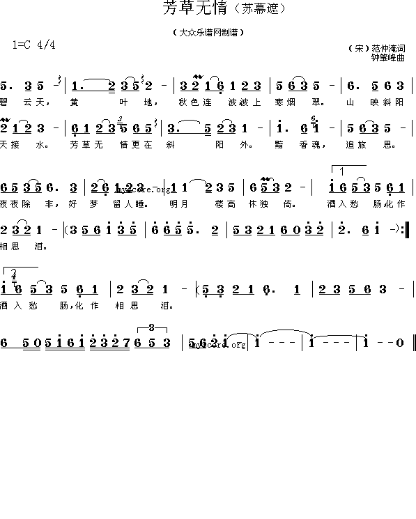 范仲淹,北宋初著名的政治家、军事家,其文学才华也光芒四射。散文、诗、词皆有名篇传世。尤其是散文《岳阳楼记》历来被推为名篇极品,垂范千古。有《范文正公集》,词仅存五首较完整,但无一不是经典之作,足可与其他宋代词人相提并论而毫不逊色。范仲淹的词贵在意境开阔、气象雄伟,即使是抒写相思情爱,也极为清新刚健。这首《苏幕遮》便是传诵千古的不朽杰作。