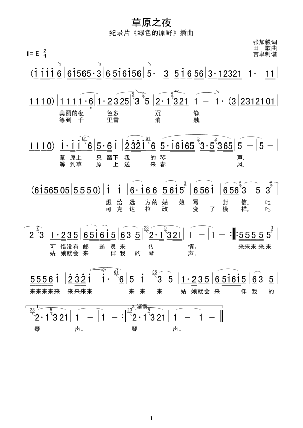诞生于1959年《草原之夜》是八一电影制片厂拍摄电影纪录片《绿色的原野》中的插曲,田歌谱曲、张加毅填词,孟贵彬演唱。这首歌被称为"东方小夜曲",曾被联合国教科文组织定为世界著名小夜曲,也是中国民歌经典,1959年以来历经60多年而久唱不衰