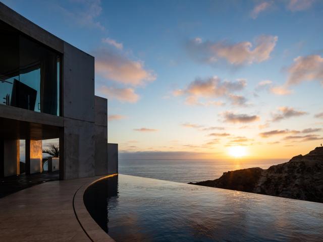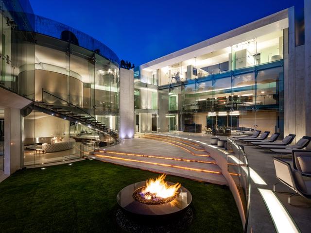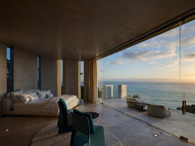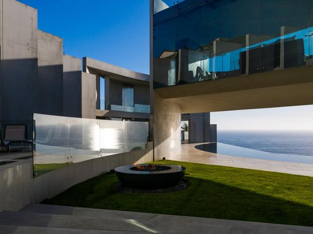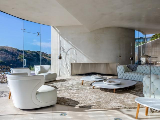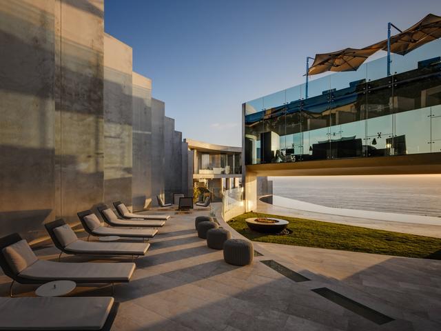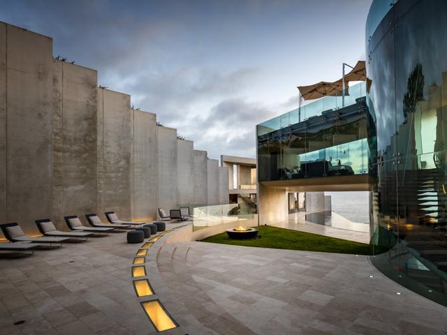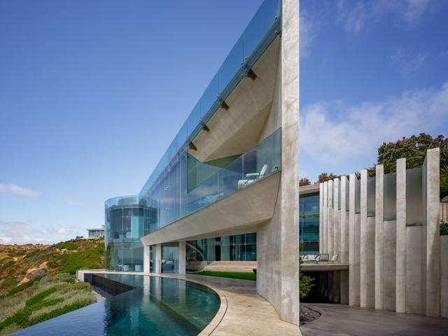 该项目总面积为 1072.6㎡,拥有 4 个卧室、8 个卫生间,混凝土、玻璃和钢铁材料是这栋别墅的主要材料