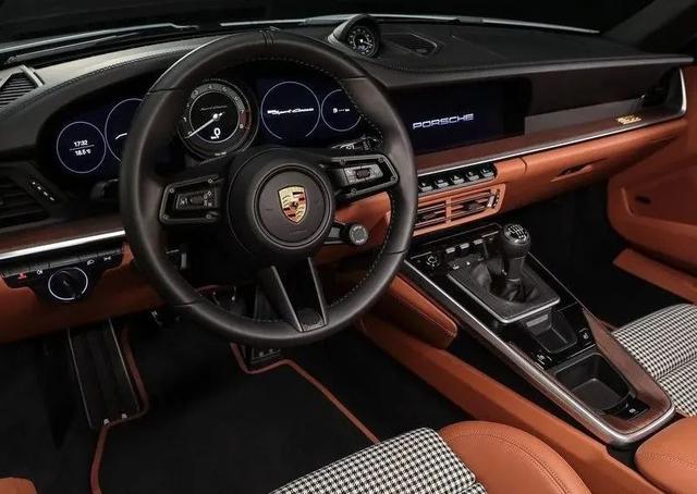 内饰也针对特别版 911 进行了升级。自 918 Spyder 以来首次使用半苯胺皮革,与布制座椅垫、布制门板和木质装饰相结合,营造出 1960 年代末至 1970 年代初的氛围。转速表采用复古风格,在整个内室中可以看到大量保时捷品牌以及 Porsche Exclusive Manufaktur 标志。它仍然是四人座的, 911 Sport Classic 的目标不是成为硬核赛道机器,而是成为一款令人愉悦的驾驶车辆。