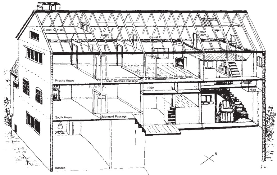 教徒们藏身之所称为“神父穴 'Priest Holes' ”非常狭小一般在房屋的隐蔽处或楼梯间。这也能理解歌中楼上楼下的走动。这一时期称这些为狂热的教徒 (Zealous Protestants)