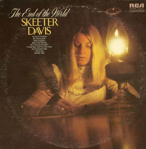 《The End Of The World》是一首 史琪特·戴维丝 演唱的歌曲,于1963年3月1日发行,收录于《The End of the World》专辑中。 史琪特·戴维丝(Skeeter Davis,1931年12月30日—2004年9月19日), 是美国著名的女乡村音乐歌手。她最著名的金曲是1963年的" The End of the World "。史琪特·戴维丝一生共获得过5次 格莱美 提名,并在1964,1965,1967和1972年4次荣获格莱美乡村最佳女歌手大奖。