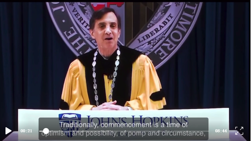 Remarks as delivered by Johns Hopkins University President Ronald J. Daniels for delivery at the universitywide Commencement ceremony on May 21, 2020.