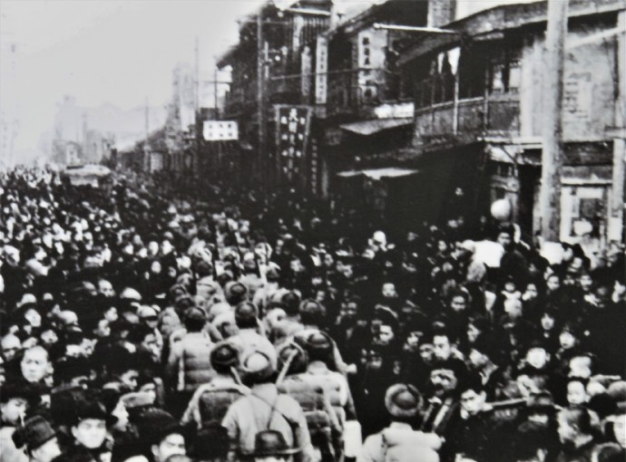 北平市民、学生和工人们如潮水般从四面八方涌向入城队伍经过的路线,所有人几乎都拿着小彩旗,热烈地欢迎入城队伍。