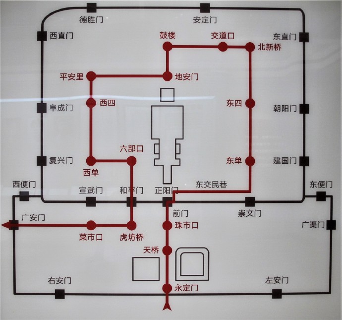 经永定门大街、前门大街,进入东交民巷,再经崇文门内大街、东单、东四、北新桥、太平仓;另一路则由西北面的西直门入城。两路队伍会和后,再折向南行,经西四、西单、西长安街、和平门、骡马市大街,由广安门出城。