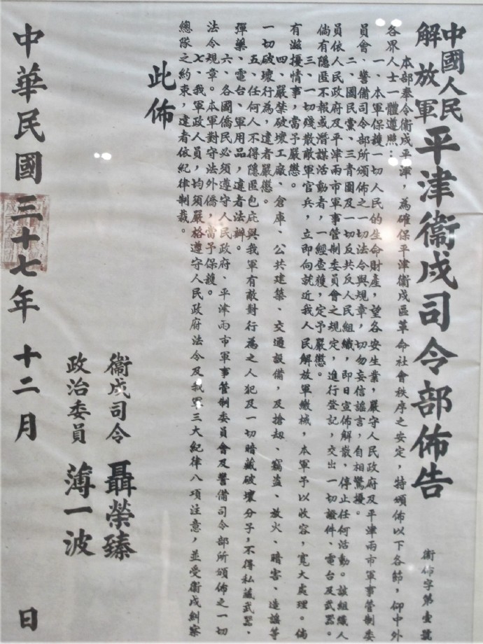 1949年1月22日,傅作义在《关于和平解决北平问题的协议》上签字,并令所率部下八个军、25个师共25万守军全部出城,到城外指定地点接受解放军改编。