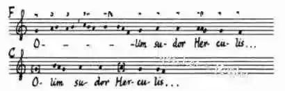 《卡尔米纳·布拉那》中大约有四分之一的诗歌设有音乐旋律,其记谱使用了一种叫做纽姆[3]的古老记谱方式。纽姆记谱法只是给出了后一个音符是否比前一个音符的音值高还是低的提示,但是并没有标注两个音之间的音程关系。因此,纽姆记谱法一般仅供熟悉旋律的演唱者使用,主要起到提示作用。