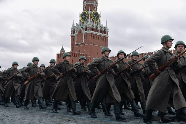 依次是鼓乐队、迫击炮学校和列宁军政学院的学员,接下来是第323步兵师、第2步兵师、内务部队捷尔任斯基步兵师和特种任务团,之后是武器装备分队。一队队战士列成徒步方阵走过,军士的双肩和后背都是雪,不少的士兵满脸灰尘、衣着邋遢。军容相当疲惫,队列显得凌乱。战士身背行囊带带足子弹,离开红场后,将直接开赴前线。各类大炮包括从博物馆里拉来的古董大炮,只要还能打就被运往前线。七拼八凑而来的各型坦克,毫无排面地通过红场。在漫天的大雪中,共有28467名红军官兵接受了检阅,很多人都没能活到战后。