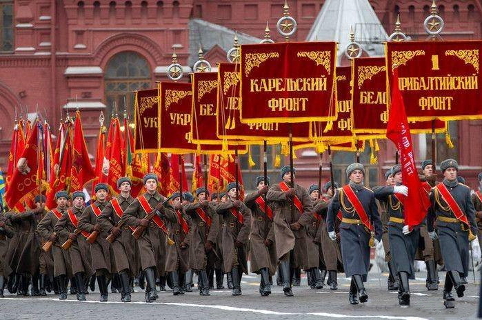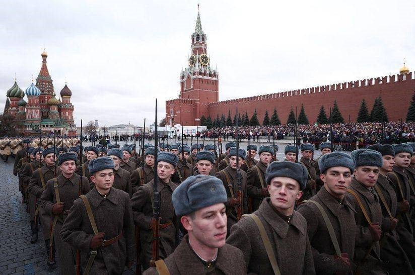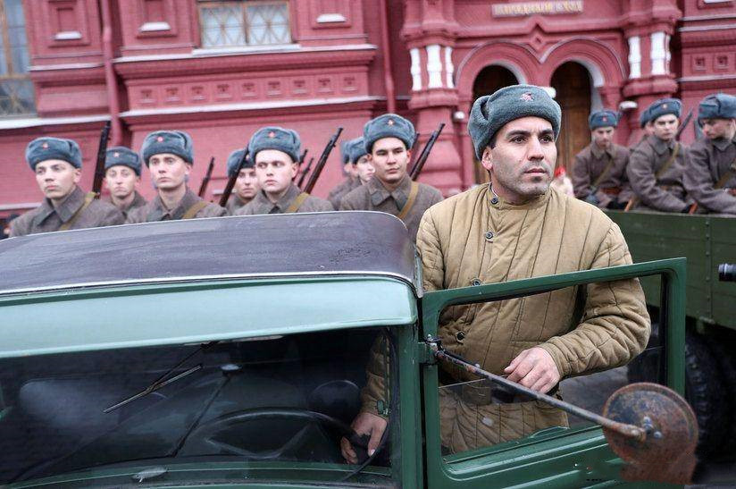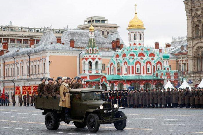 1941年11月7日,在莫斯科红场举行了纪念伟大十月社会主义革命24周年的阅兵式。这场阅兵式是在德军兵临莫斯科城下时举行的声势浩大的阅兵式,数十万红军官兵走过主席台接受斯大林等苏联党政领导人的检阅。之后,他们奔赴西部前线抗击法西斯德国军队的入侵。