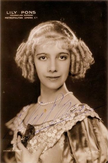 莉丽·庞斯(Lily Pons,法国花腔女高音歌唱家。莉丽·庞斯原名爱丽丝·约瑟芬·庞斯,生于法国戛纳附近德拉吉尼昂,1940年入美国籍。早年在巴黎音乐学院主修钢琴。1925年从戈罗斯梯阿学习声乐。1928年在阿尔萨斯的米卢斯首演歌剧《拉克美》(德里勃作曲,饰女主角拉克美),得到好评。