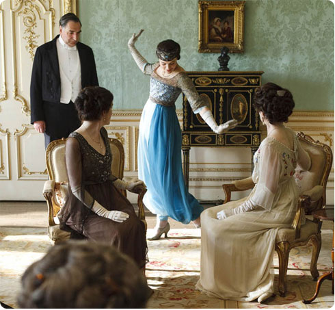 英国电视剧《唐顿庄园》里三小姐茜玻蓝色灯笼裤装