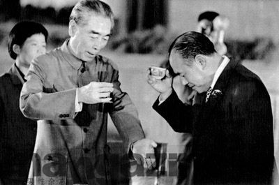 1972年9月28日,时任日本首相田中角荣到访中国,受到周恩来总理在北京人民大会堂的设宴款待,席间,总理与田中首相互相敬酒。周恩来在这次会见中提出要将中日关系“开启一个新的篇章”