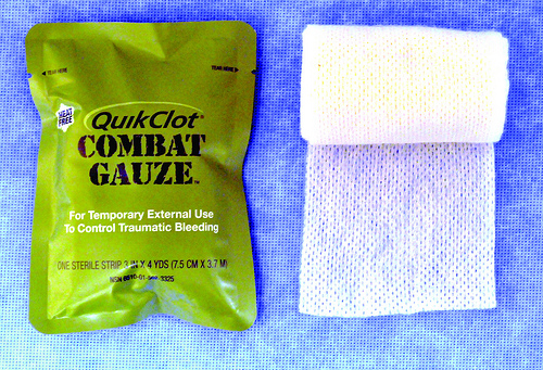 在战场上的阵亡官兵中,有50%因为大量失血而死在 送到医院之前而丧命。因此,Combat Gauze不但经济便宜,而且在纱布混合了可用于凝血的无机矿物高岭土成份,在无法提供止血带的战场上特别好用。