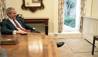图为在美国首都华盛顿的白宫,总统布什在休息厅里通过小电视直播观看“发现号”航天飞机的发射。