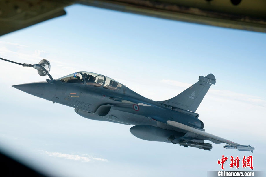 图为3月19日,一架法国阵风战机攻击利比亚期间由一架空中加油机进行加油作业。