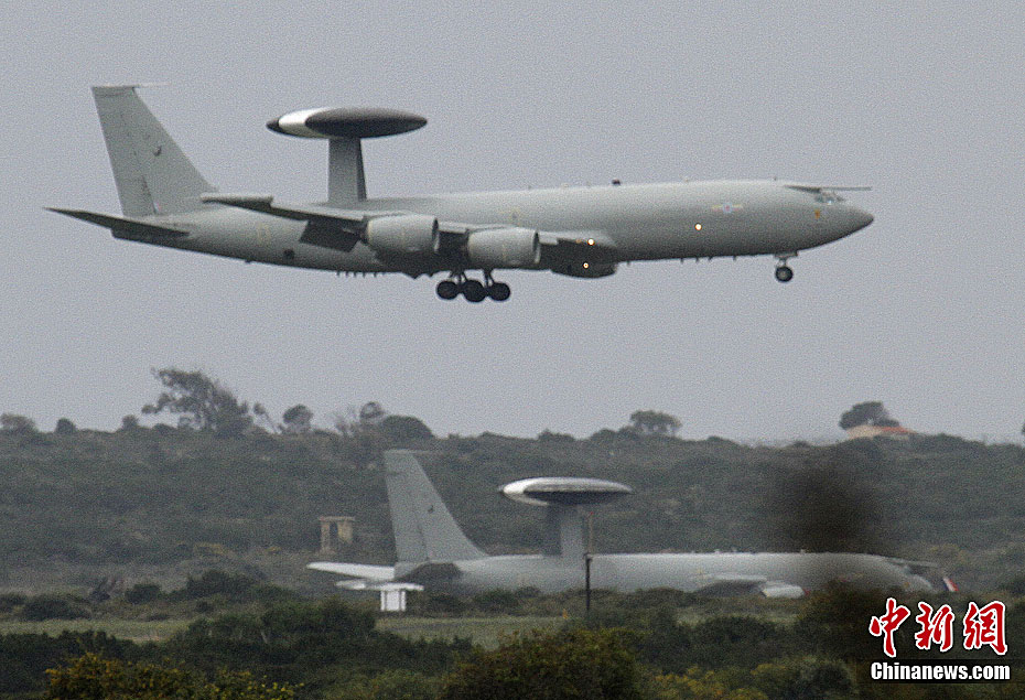 图为3月20日,英国空军E-3D空中预警机进驻位于塞浦路斯利马索尔的阿克罗蒂里军空军基地,这些预警机将参与打击利比亚军事任务。