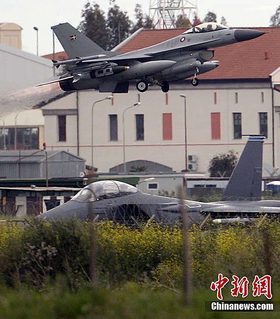 图为3月20日,丹麦空军的F-16战斗机飞抵意大利西西里岛的空军基地。