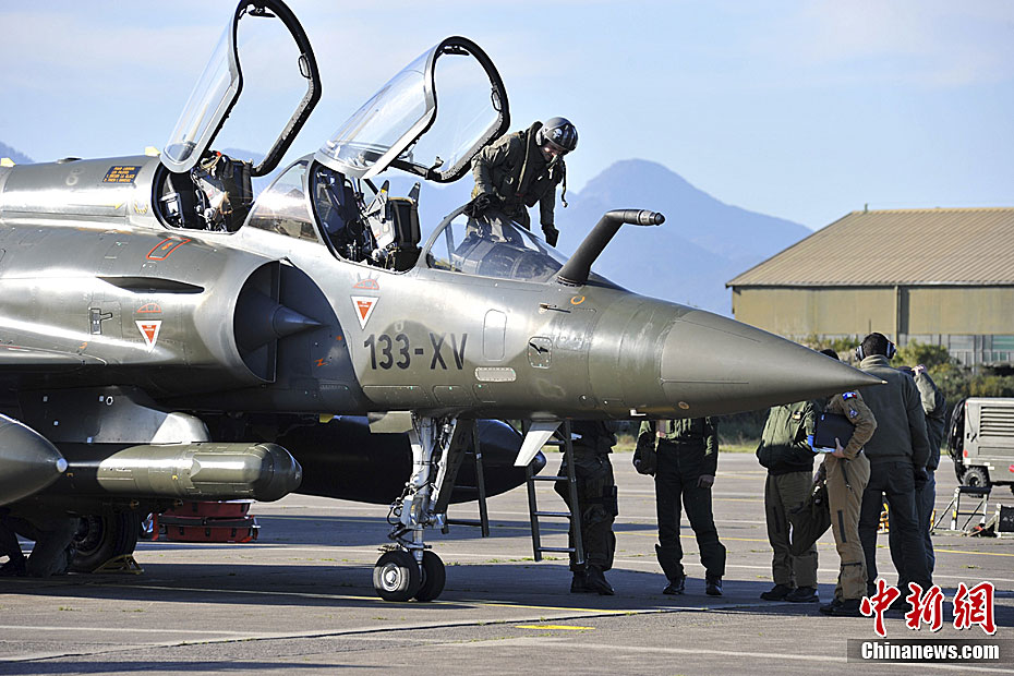 图为3月20日,法国空军的幻影2000战斗机在意大利科西嘉岛上的空军基地进行补给。