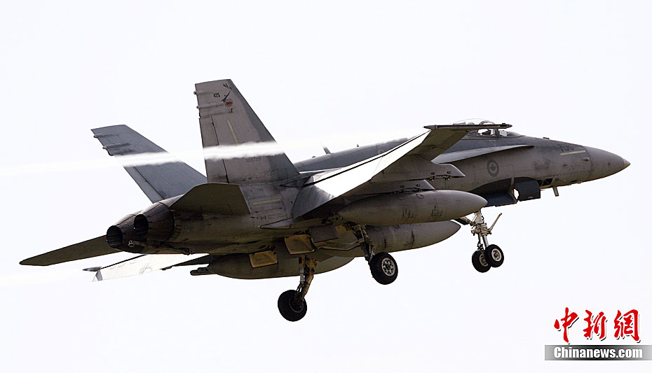 图为3月18日,一架加拿大空军的F-18战斗机在意大利西西里岛南部的空军基地起飞。
