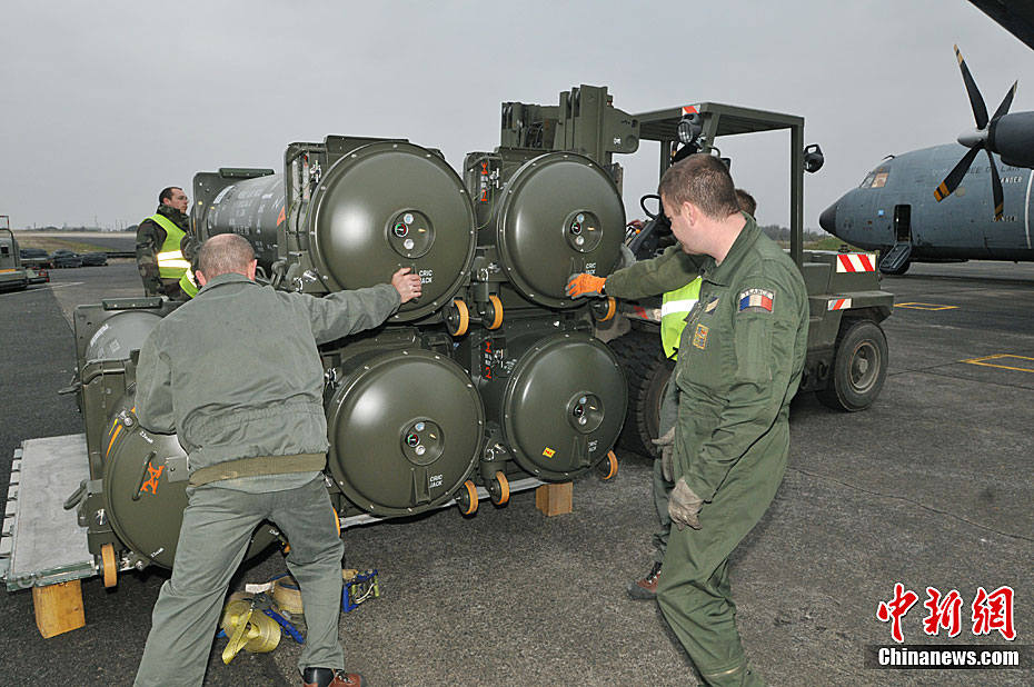 3月19日,法国空勤人员正在将弹药运抵飞机。