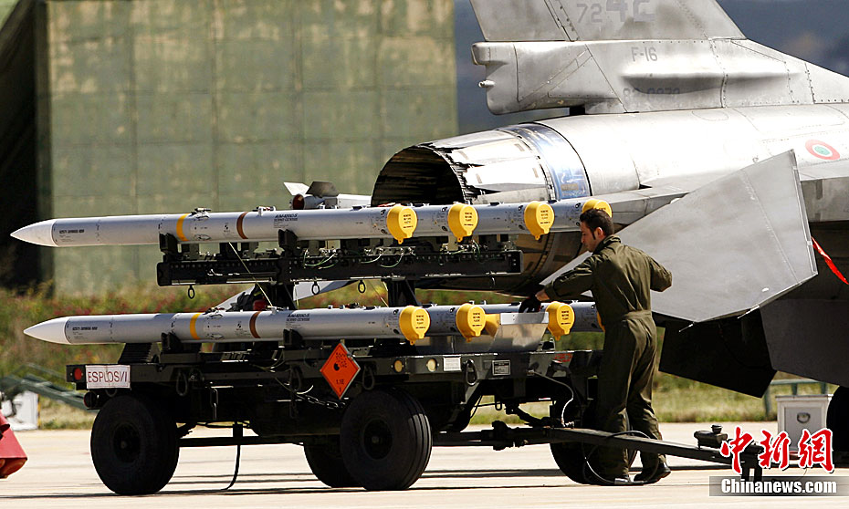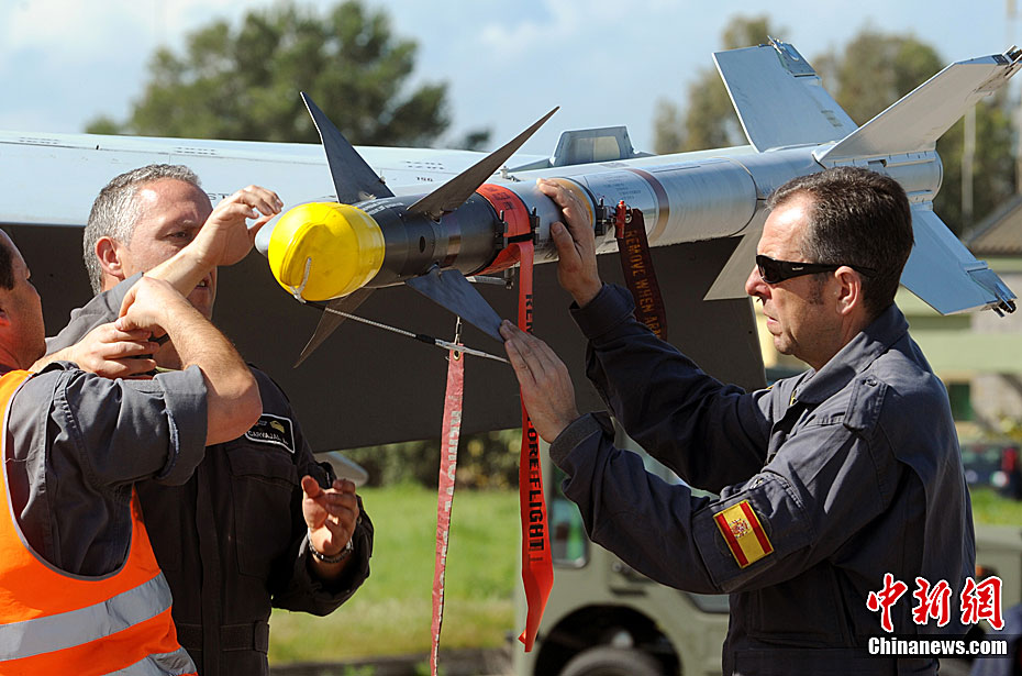3月20日,西班牙空勤人员在意大利空军基地将导弹安装在F-18战斗机上。