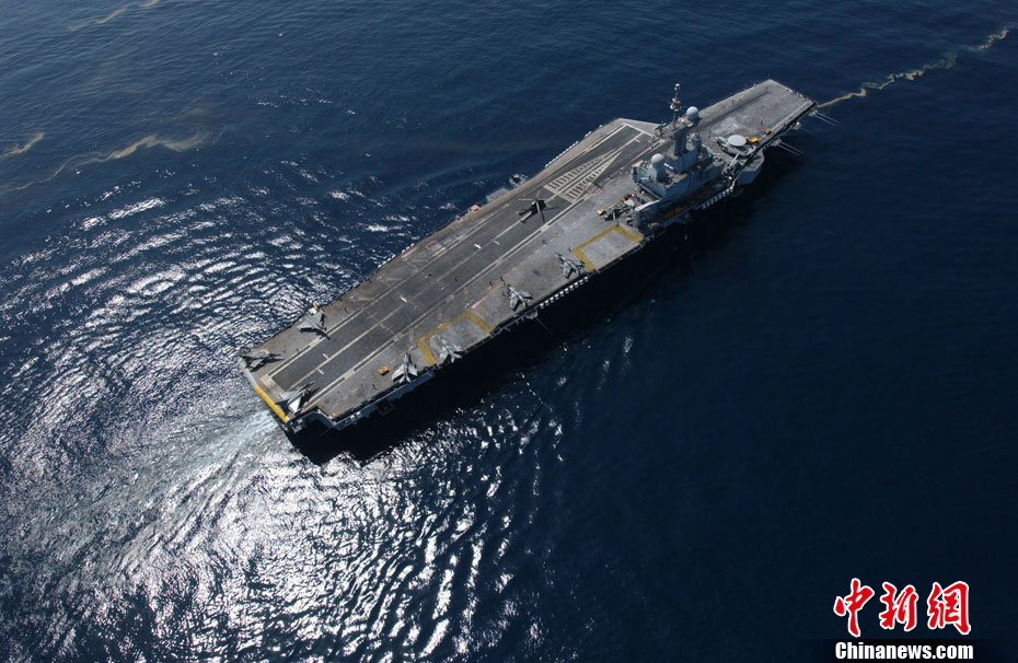 图为3月20日,法国“戴高乐”号核动力航空母舰从法国土伦海军基地启程,参与对利比亚的军事打击行动。