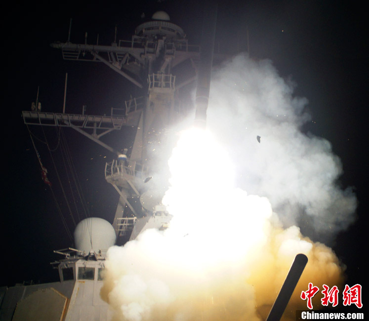 图为3月19日,美国海军“巴里”号导弹驱逐舰向利比亚发射“战斧”巡航导弹。