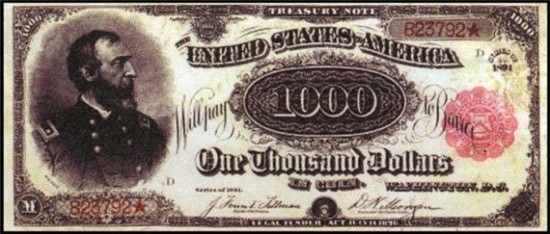 于1891年发行的红印章纸钞在当时票面价值为1000美元。这款纸钞印有二战时期美国著名陆军上将乔治·戈登·米德的头像。由于历时久远,几经数次易主,这款稀缺的纸钞已经成为了世界上售出的最贵的纸币之一。2013年4月,红纸钞最终以250万美元售出。