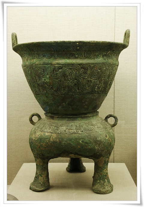 甗(yan,音演):相当于现在的蒸锅。有圆体三足和方体四足两类。全器分上、下两部分,上部为甑(zeng,音赠),放置食物;下部为鬲,盛水。如甑与鬲铸为一体称为合体甗,其中部有一铜片,叫做箄(bi,音比)。上有能够通蒸气的十字孔或直线孔。