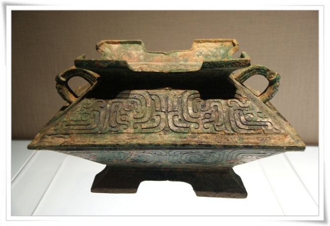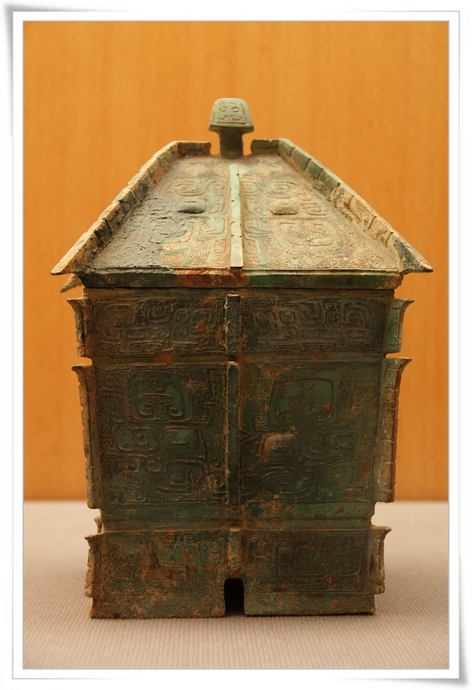 方彝:[/B]为盛酒器,或为调和酒、水之器。彝也是古代青铜礼器的通称。形制为方形,高身,腹有曲有直,带盖,盖似屋顶形,盖上有钮,有的带扉棱。