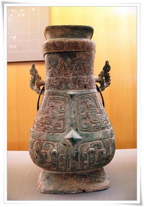 罍(lei,音雷):是古代的酿酒器,又为大型的盛酒器。形制大体分为两种:圆形罍和方形罍。其特征是敞口、短颈、广肩、肩上有两耳,正面下腹有一穿系用的环鼻,以系绳提取倾酒之用,圈足。
