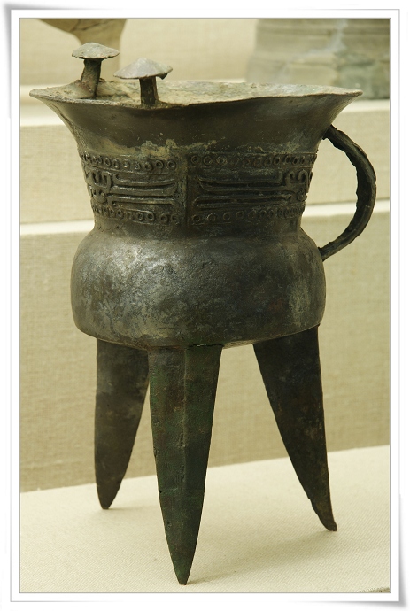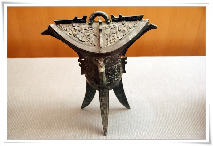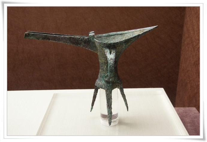爵(jiu, 音决):古时饮酒器的总称,相当于现在的酒杯,是中国古代最早出现的青铜利器之一。基本形制为圆腹,前有倾酒用的瓦筒似的流,后有尖状尾,腹侧有鋬,口上有两柱,腹下有三尖足。