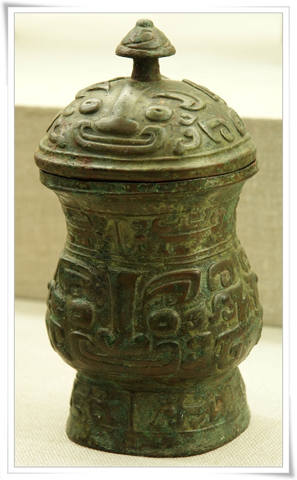 觯(zhi,音志):饮酒器。形似尊,容量却小于尊,且鼓腹下垂、侈口、圈足,大多数有盖。