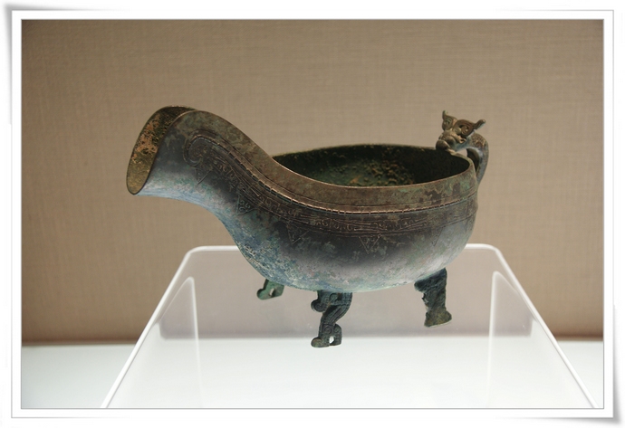 匜(yi,音仪):古代盥洗时的浇水器,与盘是一套器具。形体椭圆似瓢,前有流可注水,后有鋬可执拿,下有三足或四足或无足,有的带盖。