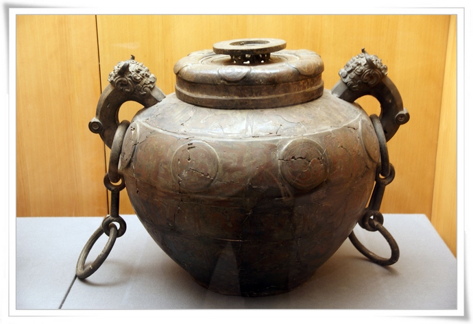 缶(fou,音否):盛水或酒的器皿,基本特征为圆腹有盖,腹上置两或四环耳圈足,也有方形缶。
