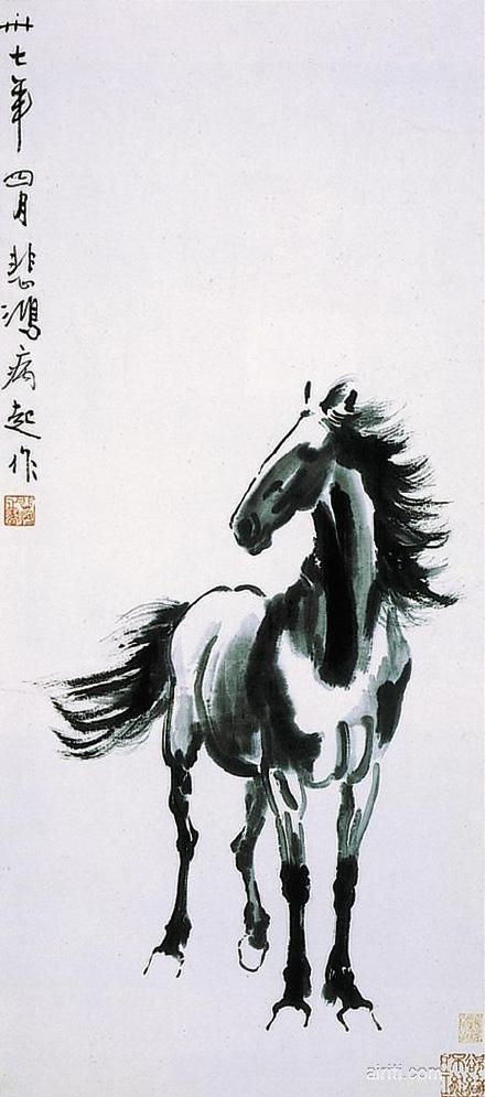 文物描述:一马临风而立,英挺雄伟。本幅以大笔写意方式描绘,故具有传统的笔趣墨韵。而徐氏画马时,已融入他习素描所养成之观念,故在写意中,亦带有相当程度的西画影响。