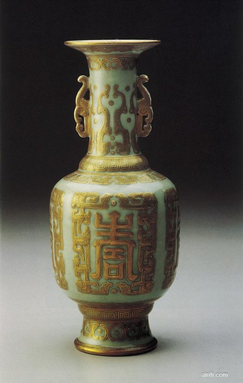 文物描述:盘口,值颈,圈足外撇。冬青釉地,描金图案。口沿下画如意云头文及夔龙纹各一周。颈、耳亦画夔龙纹,肩饰莲办纹与夔龙纹各一周。腹部以夔龙纹危框,内书寿字。腹部以下为莲瓣纹、回纹、夔龙纹及图案。底描金「大清干隆年制」,六字篆款。