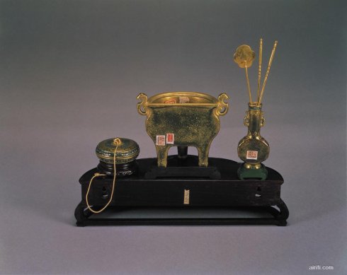 文物描述:带镀金香铲、香箸,原贮清宫多宝格之中。三件均为瓷胎,釉色为茶叶末釉加洒金彩及铜绿色彩釉。纹饰或浅浮雕,或堆泥,极尽装饰之能事。香炉内有铜胆,可焚烧沈香木细条。器底刻有「乾隆年制」篆款,阳文。 这套炉瓶盒是为了使用方便能贴近壁角而作成半片,香炉炉身只有半个。香瓶的瓶腹削去一部份,以至于瓶身亦可贴近墙壁。为了配合贴近墙壁来摆置的设计理念,所搭配用的木座木台也做成半片的模样。为了使用搬动时的方便,炉瓶盒三件均嵌入木座中。木座插榫于木台上而成一整体。木台呈海棠花式,只有半片。木台底座雕花镂空,极为考究。此香具原来收贮于多宝格中,它的底部原有暗格可以收贮香箸香铲。然后全套香具连同木座木台一起装入精美的小木箱中。炉:两附耳,三足。口有折边,短颈,硕腹。釉色以黄铜色的茶叶末釉为底,加喷金彩。纹饰部分以金线描绘,只有蟠螭纹的底色为铜绿色。瓶:釉色同前。盒:穹顶盖,盖上有纽以系绳。嵌入式器口,全器扁圆。
