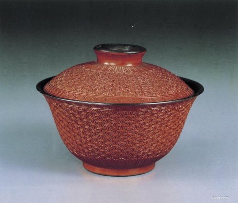 纹识描述:碗及盖内外均包银,外壁于素胎时雕刻成仿雕漆绣球纹锦地纹饰,口沿雕回纹一周,足边莲瓣纹,施透明釉烧成后,再挂珊瑚红釉,二次低温烧成。