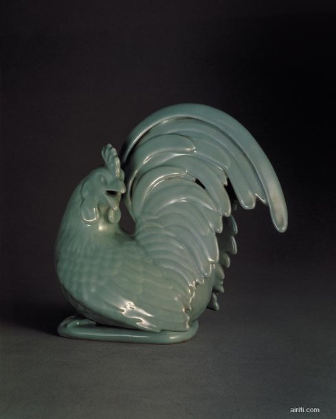 文物描述:全器呈雄鸡蹲伏的模样。尾羽高耸而丰盛。两翅扑地,鸡首向候回顾,瞪睛张口,给予人们一种蓄势啼叫,蹲而欲起的态势。雄鸡身上的每一片羽毛都经过巧手雕琢,而且逼肖生动。如果作陶者没有坚实的素描功夫,是很难达到如此写实的地步。中国传统工艺创作,除了形似之外,最讲究造「势」。例如这件雄鸡香熏,雄鸡蹲地偃羽而蓄势欲起、即将振翅高鸣。一件成功的作品就应该像这件雄鸡香熏,给予观者美好的外形之外,同时也引导观者作无穷的想象。香熏分成两部分;底为盛盘,鸡爪就贴塑在底座的宽边上。罩上鸡身,就只见鸡爪和扁平的底座。底座的扁浅,更能衬托雄鸡尾羽的高耸及斜直下偃的双翅。器底无款。器底涂釉,仅足圈及底部中央一道长条无釉。这道长条可以增强底部的支撑力量。这件香熏也如同香炉的功能一样,用来燃点香料的。中国古代所使用过的焚香料种类相当多,除了单品的檀香木、龙脑、乳香之外,最值得称道的是合香。合香的形状有丸、线、圈、及各种形状。这件香熏在鸡尾及口部都留有小孔。估计这件雄鸡香熏使用的合香如果选用让人嗅了而觉神清气爽的合香,似乎更符合雄鸡的外形设计。