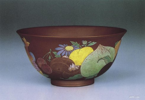 文物描述:撇口,深弧壁,圈足。口足间各饰凹棱弦形一周,内壁无纹,外壁紫砂胎上未施透明釉,而以珐琅彩直接描画花果纹,以果实为主;有桃实、荔枝、香橼、枇杷、柿子、石榴、葡萄、茡荠、菱角、樱桃等,碗底书「康熙御制」二行四字黄料楷款,不加框圈。