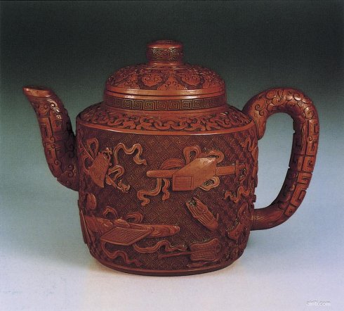 文物描述:直口,折肩,圆腹,曲流,环把,圈足。壶外除底外均涂朱漆,层次雕漆,主纹为壶两面上的两组杂宝纹饰,雕有:书剑、画轴、磬、扇子、笙、钟笛、双板、琴棋、璧等,另一面扇子则为葫芦所取代。壶颈雕回文一周,壶肩如意卷草纹一圈。盖面饰如意纹,盖纽圆形平顶,纽旁回文一道。壶内及底部露出紫砂胎地,质地细腻,间有黑黄砂点。底为紫砂烧成后,刻「大清乾隆年制」三行六字篆款。