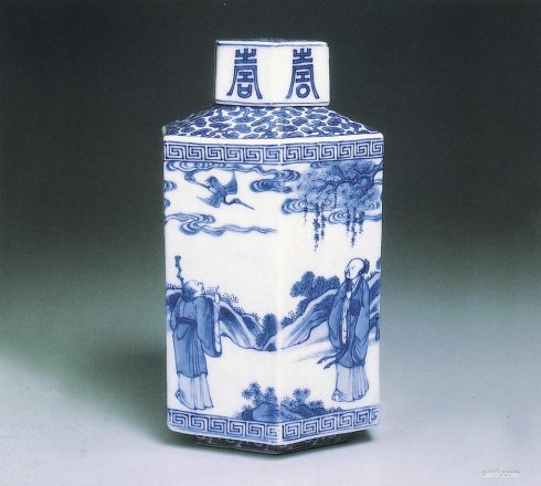 文物描述:罐呈六方形,直口,斜肩,直壁,平底,矮圈足,盖足亦为六方形,带平顶六方盖。盖面青花绘一蟠螭,盖壁饰六字三种不同书法的「寿」字,加饰青线三道,罐肩满画如意纹,罐腹则饰山水人物画,云松下二老者,一抬头持杖遥指飞翔而来的仙鹤,另一老者及一背罐童子亦仰面迎望飞鹤,罐腹上下各饰回纹一周,足边则为转枝叶纹一周。胎质细腻,釉色鲜丽匀浓、浓淡层次分明,为典型康熙青花釉色。底青花书「大清康熙年制」六字二行楷款。同类造型亦有锡制茶叶罐。