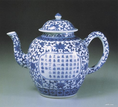 文物描述:圆唇口,短颈,腹硕长,凹足,湾流,弓形把,带莲苞纽拱形盖。器腹两面开光,内各书嘉庆丁巳年(二年1797)御制诗一首。其下有「嘉庆丁巳小春月之中□。御制」款识,及「嘉」「庆」圆方二章。余隙及盖面把、把、流均绘转枝莲纹,盖纽一半涂青、半留白,颈饰卷草纹,底边莲瓣纹一周。青花釉色匀深,胎骨略重。底青花书「大清嘉庆年制」六字三行篆款。