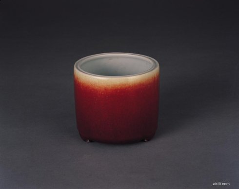 文物描述:器呈直筒形。敛口,深直壁,底平,三短足。口沿凹下,器底洼陷一圆。胎骨厚重。外壁挂色泽鲜艳之铜红釉,釉面有纹片及棕眼。铜红釉稍具流动的现象,口沿部分稀薄,几乎呈白色,近器底铜红釉积聚成滴,几成黑红色。积釉未经修磨。口沿及器内为纯白釉,釉面多针眼。器底另有一圈垫烧痕,无釉露白瓷胎。无款识。
